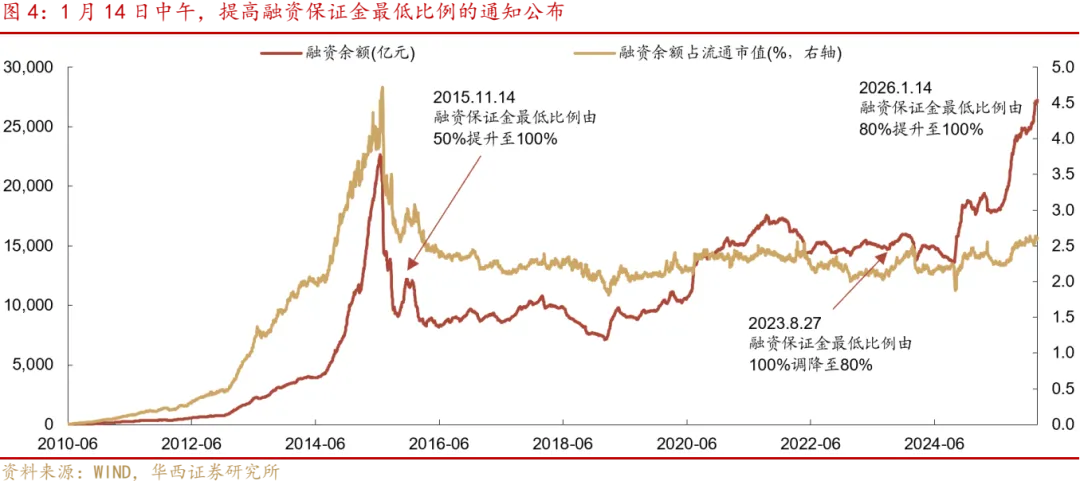1月14日中午,沪深北交易所发布通知调整融资保证金比例,将投资者融资买入证券时的融资保证金最低比例从80%提高至100%。回顾调整融资保证金比例的政策脉络,2015年11月13日,证监会宣布将保证金最低比例从50%提高至100%;2023年8月,沪深北交易所将融资保证金比例从100%降低至80%。本次政策将80%调回100%,主要传达了引导市场有序运行的态度,且政策出台于情绪高涨之初,有望降低中长期维度的潜在波动。