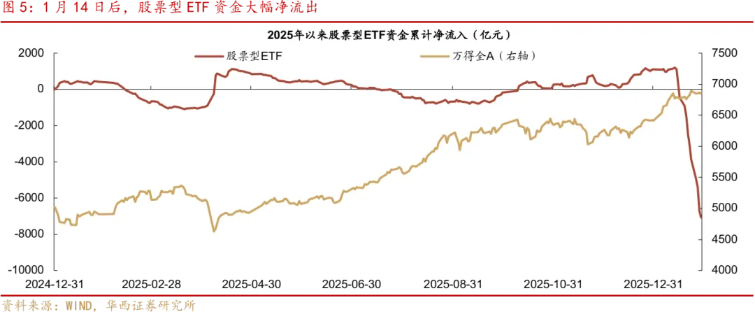 降温信号明确后,股票型ETF遭遇大幅净流出。1月14日至29日,股票型ETF净流出8175亿元,其中宽基ETF净流出9505亿元,流出幅度历史罕见。同时,部分跟踪上证50、沪深300的ETF放出“天量”成交,资金兑现倾向明显。宽基ETF大规模赎回&成交,或是市场在监管的引导下,主动修正非理性行为的痕迹。