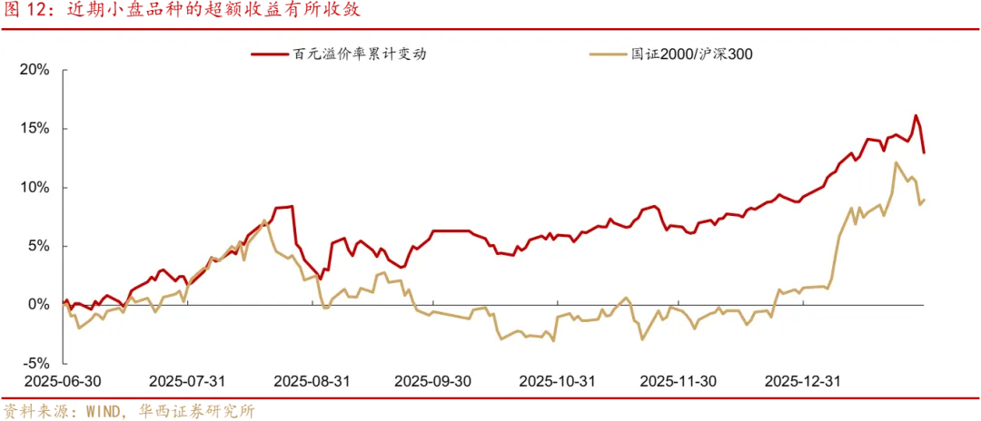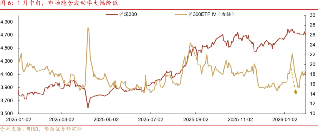 降温政策效果出色,市场隐含波动率大幅降低。1月中上旬,沪300ETF IV指数持续上升,指向市场投机热情持续升温。通常而言,在牛市状态下,若隐含波动率上升到高位,意味着短期或将经历大幅调整,例如2024年9月、2025年8月等。而在1月14日降温政策出台后,市场隐含波动率迅速下降,一度降至去年12月行情上涨之前的水平,指向投机资金被陆续清出。