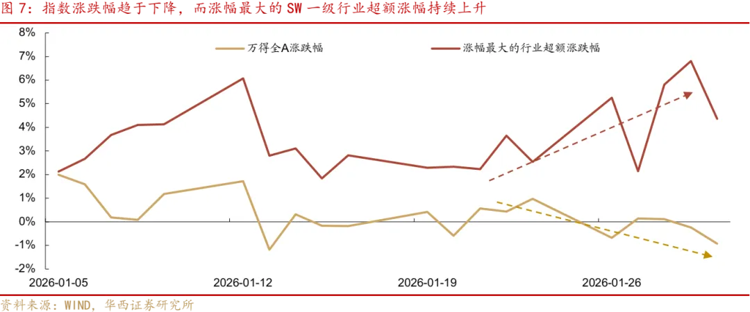 尽管指数在1月中旬持续震荡,涨跌均不明显,但结构行情却并不平静。事实上,牛市延续仍然是市场共识,在指数机会不明显的情况下,资金对结构的博弈愈发激烈。从万得全A涨跌幅和涨幅最大的SW行业超额涨跌幅来看,指数涨跌幅在1月下旬趋于下降,而涨幅最大的SW一级行业相较于万得全A的超额涨跌幅持续上升,指向当日涨幅领先的行业基本实现了超群的涨幅,且相较于其他行业涨幅愈发凸显。