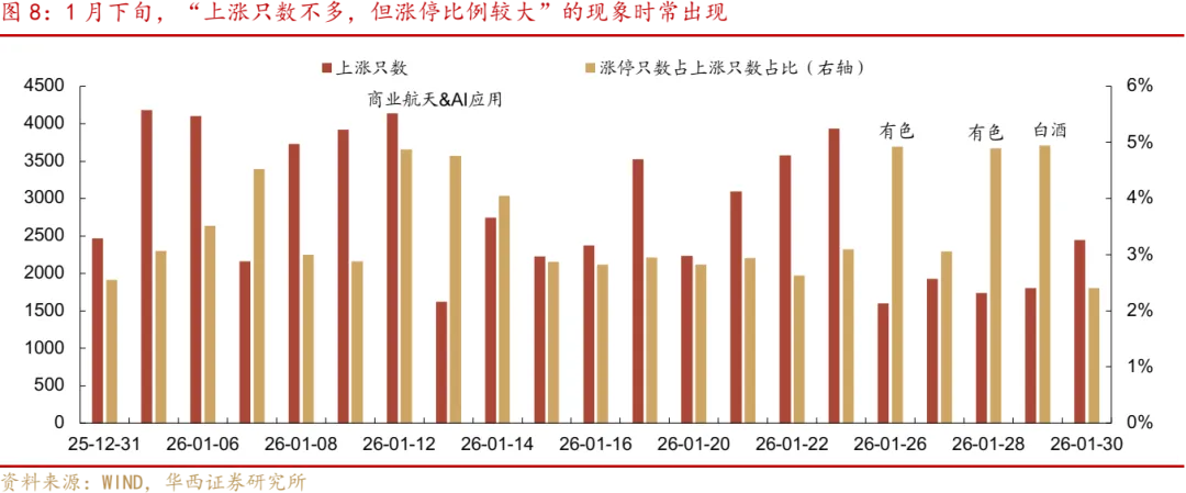 结构超额行情的背后,是偏好参与加速行情的资金并未停歇,“小范围突袭”成为交易策略。从上涨只数和涨停只数占比来看,1月中旬以前,涨停只数占比较高的日期,基本上涨只数较多;而到了1月下旬,则经常出现“上涨只数不多,但涨停比例较大”的现象,指向行情分化明显,上涨个股批量涨停,但其他板块行情相对冷清。结合行业来看,有色在1月26日和28日迅速上涨,而白酒则在1月29日大涨,只数成分股大面积涨停。这些行情并不能简单地用“趋势”和“反弹”来解释,而更可能是资金捕捉到上涨动向后,倾向于推动行情加速上涨,以此吸引更多的资金参与其中。