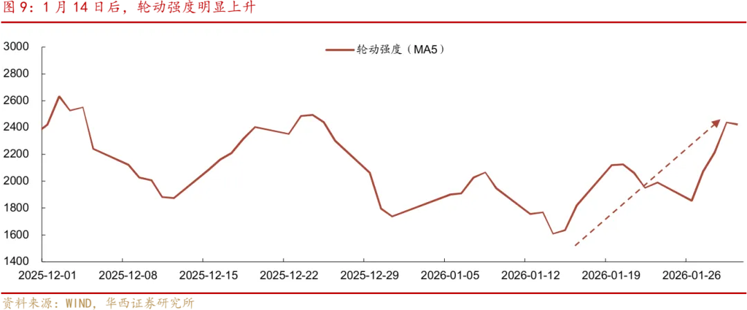 题材加速的同时,潜在涨幅也被过快消耗,资金不断寻找下一个机会,题材轮动速度明显上升。我们将31个SW一级行业5日涨跌幅进行排名,计算对应行业该日的排名较前一日变化的绝对值,并将所有行业排名的变动绝对值相加,作为该日的轮动强度。从结果来看,1月14日后,随着商业航天行情不再持续,轮动强度明显上升。这也意味着,在市场情绪降温后,进行短线博弈的难度增大。