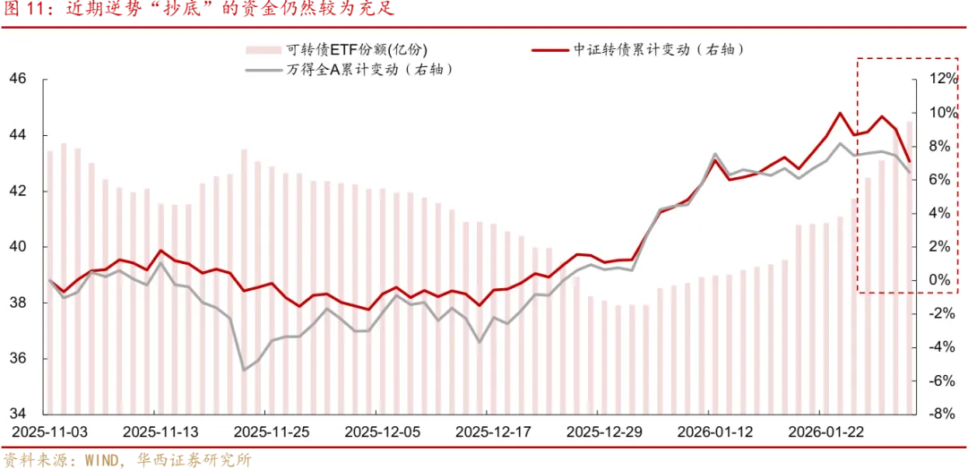 展望当下机构行为,转债需求仍然较强,只是会对波动更加敏感。1月下旬,转债指数震荡回调,转债ETF份额却进一步增加。需要注意的是,这些高位逢调整“抄底”的资金,更多可能是交易型而非配置型资金,对后续行情的波动会更加敏感。 参考8月末转债市场表现以及ETF份额变动,彼时转债ETF同样逆势增长,但随后10-11月,正股进入震荡区间之时,转债ETF流出规模同样较大。因此,转债需求暂无需过多担心,只是申赎频率可能会有所增加,从而加大市场波动。