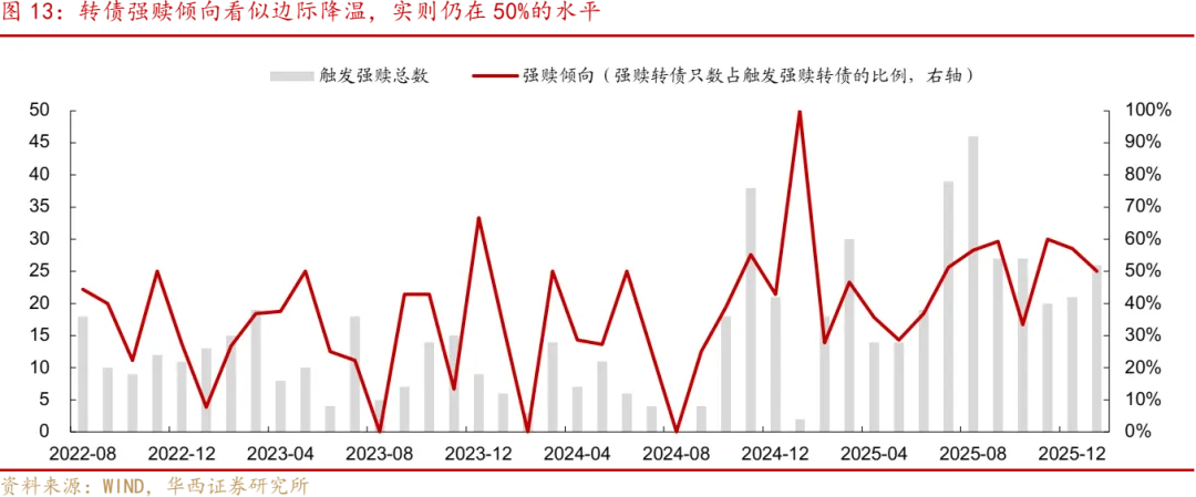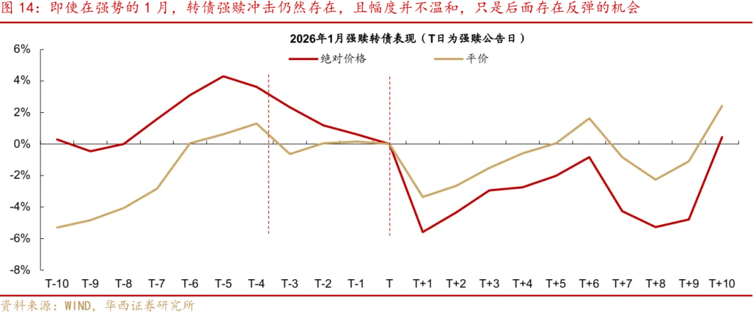 其二,转债强赎倾向看似边际降低,实则仍在50%的水平,约半数转债发行人仍会考虑执行强赎。同时,即使在强势的1月,转债强赎冲击仍然存在,且幅度并不温和,单日回调超5%是常态,且在可能赎回公告日便面临较为明显的估值压缩压力。只是在正股相对较强的环境下,总会存在超跌反弹的机会,仍然具有一定容错率。