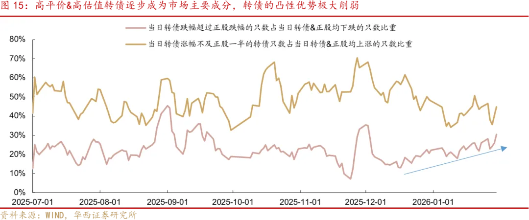 其三,高平价&高估值转债逐步成为市场主要成分,转债的凸性优势极大削弱。我们以140元平价以上&15%以上溢价率的转债为样本,当中统计了当日转债跌幅超过正股跌幅的只数占当日转债&正股均下跌的只数比重,从去年12月中下旬以来,该数据持续拉伸,指向较多转债很多时刻并不具备估值保护能力,反而是拖累项。同时,我们也统计了当日转债涨幅不及正股一半的转债只数占当日转债&正股均上涨的只数比重,该数据基本在50%附近震荡,同样意味着,高平价但高估值的转债,弹性其实一般,很难具备像高平价低估值转债一样充足的跟涨能力。