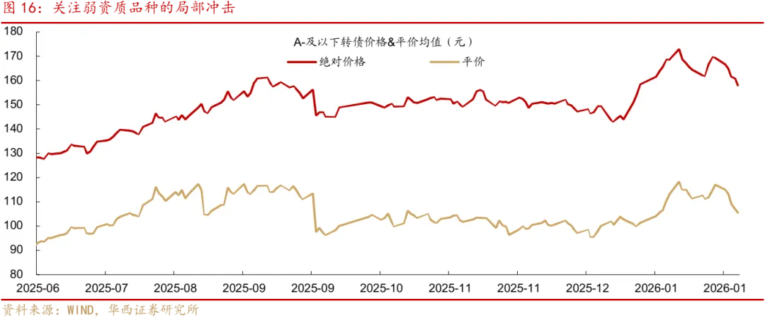 其四,年报季来临,信用冲击的潜在可能性依然存在。根据宏图转债业绩预告,其2025年净资产可能出现负值,若年报正式发布没有出现新的审计变化,将会被交易所实施*ST,若2026年净资产未能转正,则将面临实质退市压力。按当前市场情绪以及正股环境来看,相关信用事件大概率不会造成系统性影响,但对部分弱资质品种依然可能会产生外溢影响。此外,若待到3-4月,年报季正式来临之时,正股若出现偏弱震荡,信用事件依然可能会产生一定冲击。