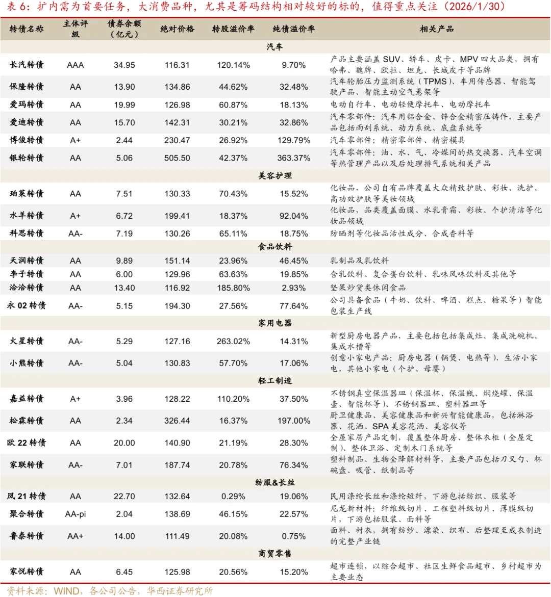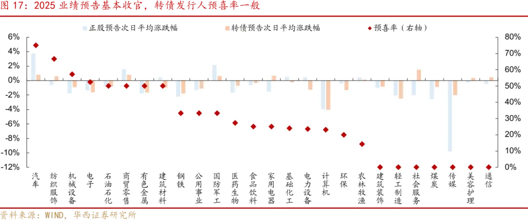 此外,2025业绩预告基本收官,转债发行人基本面支撑不算特别友好。整体层面预喜率约30%,低于全部A股的预喜率。行业层面,预喜率明显较高的汽车,正在面临购置税补贴退坡的β下滑压力,纺服存续个券也相对较少。此外,电子、机械转债的预喜率为50%,部分AI、半导体个券的业绩支撑值得重视,