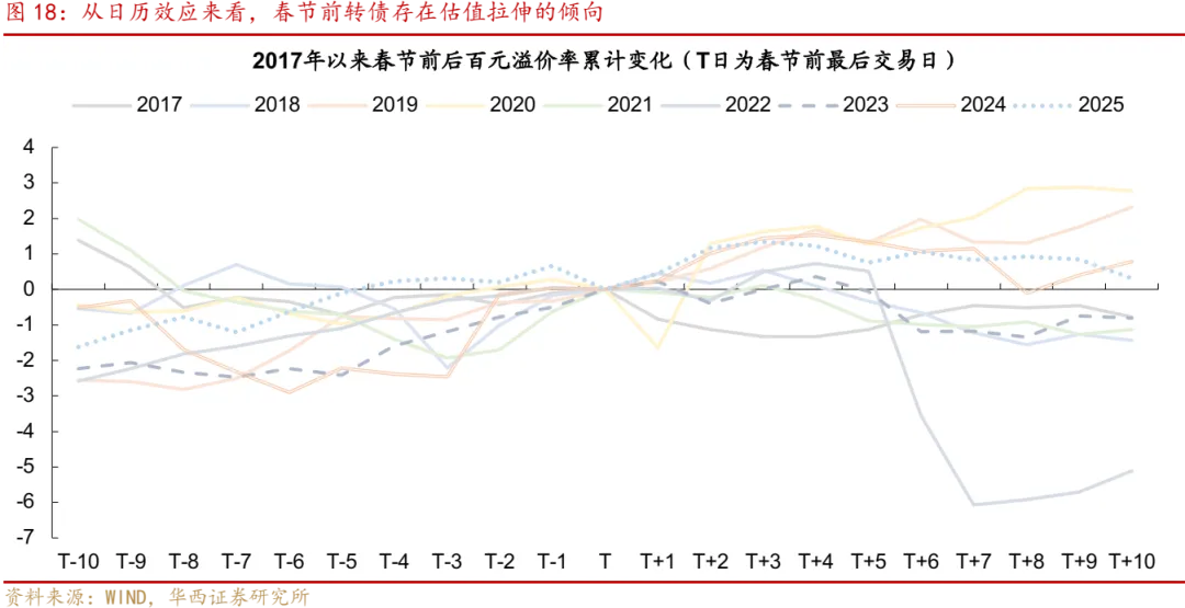 继续从日历效应来看,春节前转债存在估值拉伸的倾向,但节后容易冲高回落。我们以2017-2025年春节前最后一个交易日为基点T,统计春节前后10个交易日转债估值变动。以百元溢价率为例,除2017年和2021年春节之外,绝大多数年份在春节前均会迎来估值拉伸,这或许春季躁动以及期待“红包”行情相关。