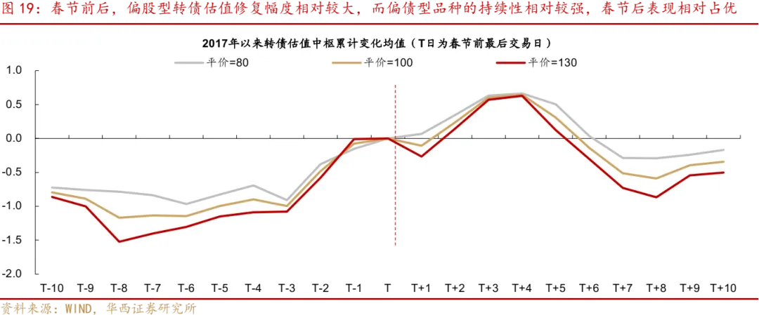 此外,我们分别以80元、100元、130元平价作为偏债、平衡、偏股型转债的代表,来观察跨年日历效应。统计方法沿用上文,结果表明,三者拉伸节奏基本相同,偏股型转债估值修复幅度相对较大,而偏债型品种的持续性相对较强,春节后表现相对占优。