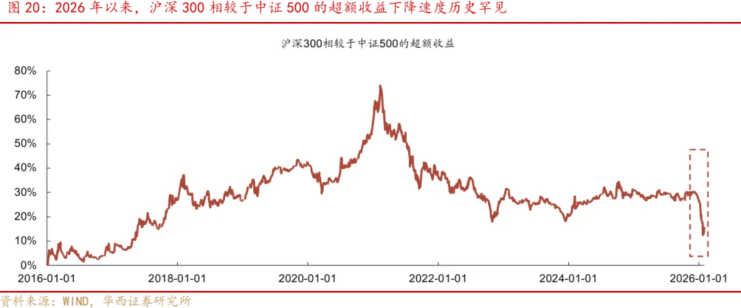 综上,题材轮动加速,短线博弈难度较大。值得注意的是,大盘品种中长期配置价值悄然出现。从沪深300相较于中证500的超额收益来看,2026年以来这一数值迅速下降,其下降速度在2016年以来罕见。这一现象的背后,或是跟踪沪深300的ETF是股票型ETF资金净流出的主要方向。同时,市场对中小盘题材的关注度较高,大盘品种则暂时不受关注。往后看,大盘品种超跌修复值得关注,若宽基ETF大幅净流出的趋势有所放缓,大盘品种有望迎来反弹。