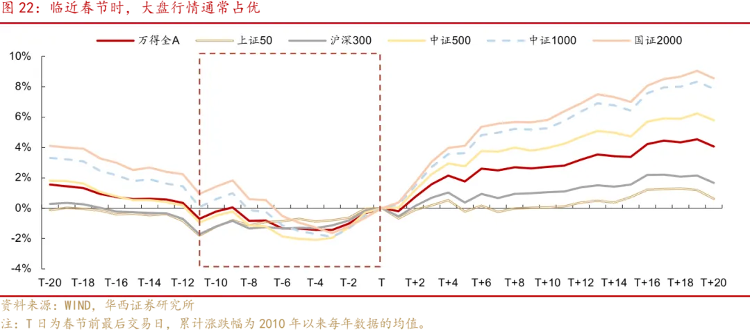 从日历效应来看,春节前大盘品种行情通常回升,而小盘行情承压。我们统计了2010年以来每年春节前20个交易日至后20个交易日,不同宽基指数的累计涨跌幅。从结果来看,上证50、沪深300平均在T-11日开始反弹,到T日两者分别上涨1.83%和1.75%。而中证1000和国证2000在临近春节时通常调整,两者在2010年以来分别平均下跌0.08%和0.09%。