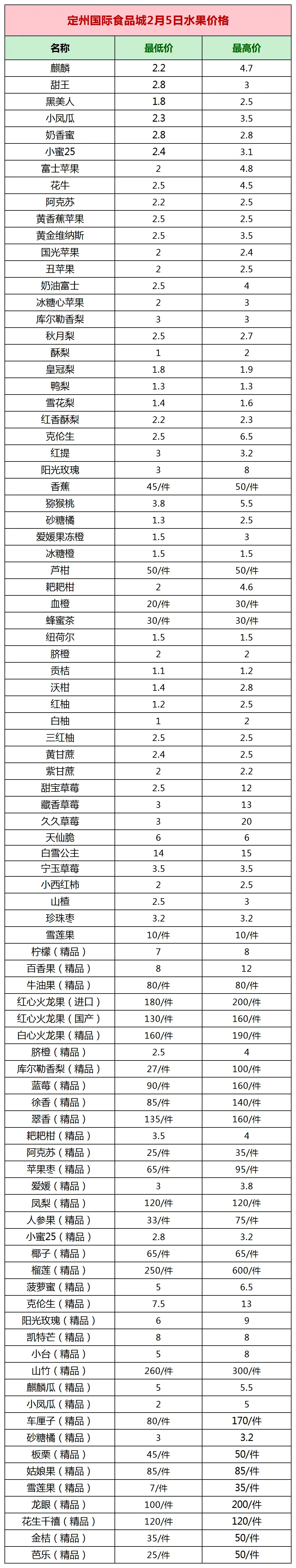 【民以食为天,365天,天天无淡季。为方便广大商户进货采买,获取最新蔬果信息,此微信号每日为您提供定州国际食品城蔬果行情。以下果蔬价格数据计量单位均为元/斤!果蔬价格行情波动比较频繁,请以实际购买单价为准!】