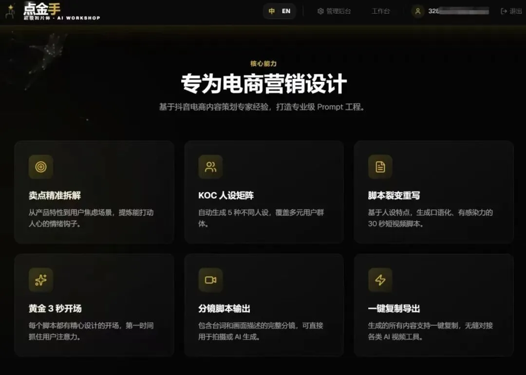但它真正的价值,在于我们沉淀了十几年电商、内容行业的实战经验,把这些经验转化成了上万条行业专属提示词语料。这些提示词不是简单的文字堆砌,而是我们踩过无数坑、跑过无数爆款后总结出来的 “内容生产密码”—— 比如怎么用一句话让 AI 生成符合电商转化逻辑的短视频脚本,怎么调整提示词让 AI 剪出有网感的镜头语言,怎么匹配品类关键词让 AI 生成的内容更贴合品牌调性。