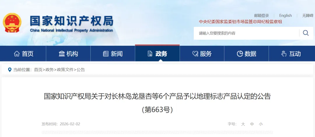 点击“阅读原文”,查看“国家知识产权局关于对长林岛龙垦杏等6个产品予以地理标志产品认定的公告(第663号)”
