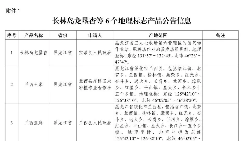 1. 长林岛龙垦杏等6个地理标志产品公告信息