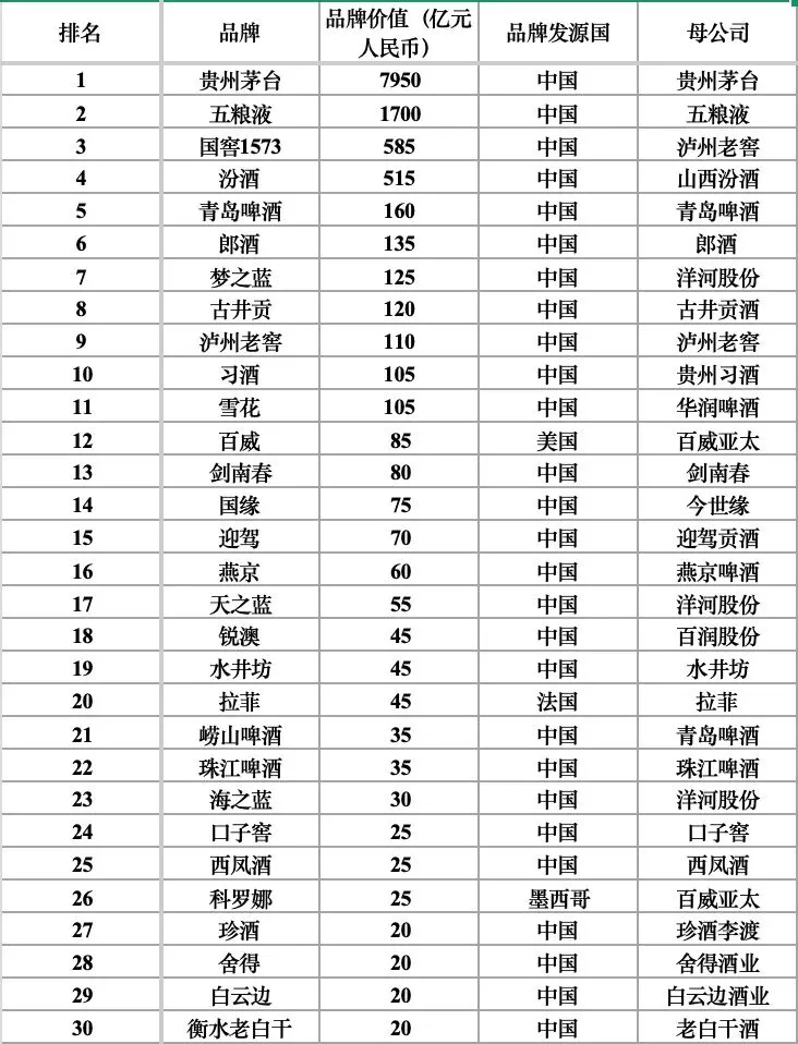 贵州茅台以7950亿元品牌价值位居第二,稳居中国品牌价值榜首;酒类依旧是中国本土品牌价值最高的行业。
