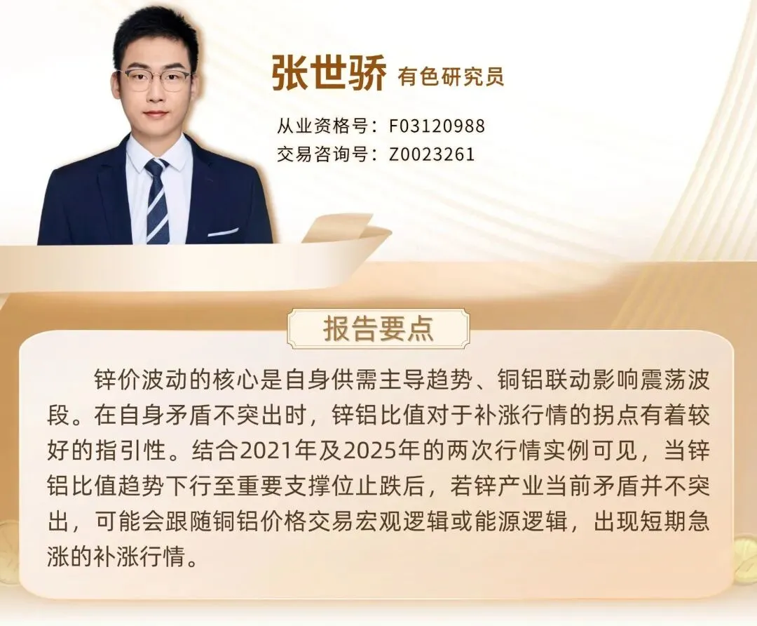 2025年12月,降息扩表的货币政策预期推动贵金属及铜铝走势偏强,12月1日至12月31日,沪铜加权涨12.27%,沪铝加权涨6.08%,沪锌加权仅涨3.74%,锌铜比及锌铝比一路下行,锌铝比值在2026年1月9日触及0.98的重要支撑位,随后锌价再次出现补涨行情。