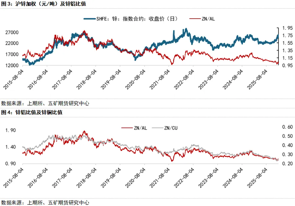 2025年12月,降息扩表的货币政策预期推动贵金属及铜铝走势偏强,12月1日至12月31日,沪铜加权涨12.27%,沪铝加权涨6.08%,沪锌加权仅涨3.74%,锌铜比及锌铝比一路下行,锌铝比值在2026年1月9日触及0.98的重要支撑位,随后锌价再次出现补涨行情。