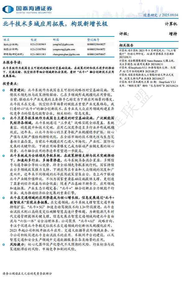 国泰海通证券: 《计算机行业:北斗技术多域应用拓展,构筑新增长极》