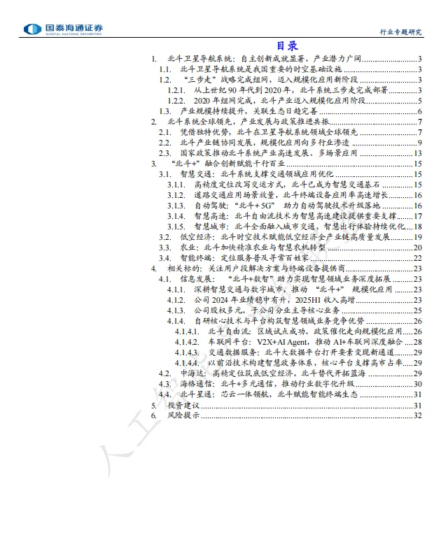 北斗系统作为全球领先导航系统,在政策持续支持与技术突破推动下,正加速向多行业、多场景渗透。从智慧交通到低空经济,从精准农业到大众消费,"北斗+"融合创新正全力赋能千行百业,成为推动经济社会发展的重要引擎。随着产品基础不断夯实,应用领域加速拓展,产业生态日趋完善,北斗融合应用的渗透率有望进一步提高,构筑起我国数字经济发展的新增长极。