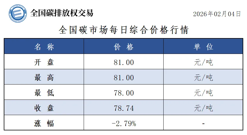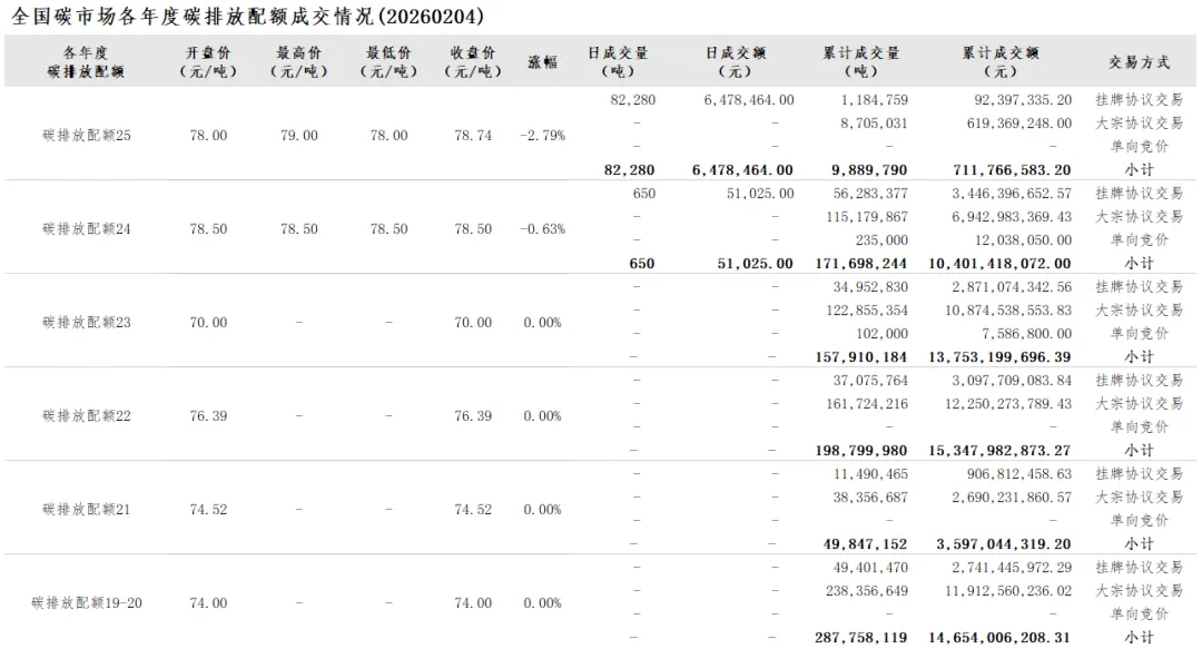 2026年1月1日至2月4日,全国碳市场碳排放配额成交量11,036,949吨,成交额802,799,520.80元。
