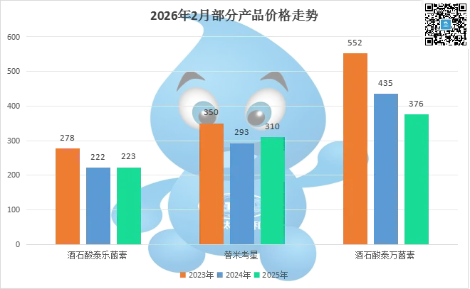 甲砜霉素,行情稳定,市场价格175,环比降幅0.6%,同比降幅12.5%,2025-2023近3年同期均价分别是196、236、363,2月行情平稳趋势。