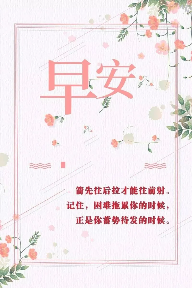 4、狂风暴雨中,哪怕被吹倒了,人也要敢于在泥泞中匍匐前进。千辛万苦中,哪怕被压倒了,人也要敢于在重压下顽强挺立。时光把过去浓缩成记忆,你可以回首,但无法回转,一切遇到的、诀别的、拥有的、失去的,都无可更改。就算命运再不堪,我们都要前行。早安!