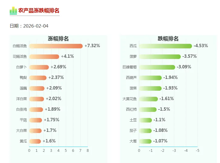 据农业农村部监测,2月4日“农产品批发价格200指数”为129.96,比昨天上升0.01个点,“菜篮子”产品批发价格指数为132.87,比昨天上升0.03个点。截至今日14:00时,全国农产品批发市场猪肉平均价格为18.38元/公斤,比昨天下降1.0%;牛肉66.20元/公斤,比昨天上升0.1%;羊肉64.20元/公斤,比昨天下降0.8%;鸡蛋8.65元/公斤,比昨天上升0.8%;白条鸡17.49元/公斤,比昨天上升1.9%。重点监测的28种蔬菜平均价格为5.52元/公斤,比昨天上升0.2%;重点监测的6种水果平均价格为7.81元/公斤,比昨天下降1.5%。鲫鱼19.48元/公斤,比昨天下降0.4%;鲤鱼14.18元/公斤,比昨天下降0.1%;白鲢鱼10.69元/公斤,比昨天上升7.3%;大带鱼43.56元/公斤,比昨天下降0.7%。今日,国内鲜活农产品批发市场重点监测的46个品种中,与昨天相比价格升幅前五名的是白鲢鱼、花鲢鱼、白萝卜、鸭梨和莲藕,幅度分别为7.3%、4.1%、3.0%、2.4%和2.0%;价格降幅前五名的是西瓜、菠萝、巨峰葡萄、西葫芦和菠菜,幅度分别为4.5%、3.6%、3.1%、2.0%和1.8%。