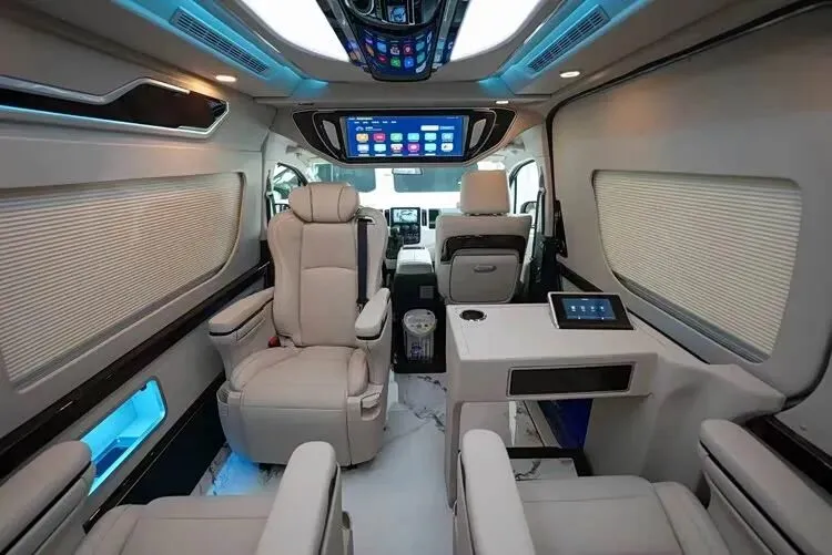 座椅之间嵌入智能触控屏,这一设计极具科技感。乘客只需轻轻触碰屏幕,就可以控制车内灯光、音响及窗帘,轻松实现“指尖上的场景切换”。例如,当想要营造一个安静的休息环境时,只需轻点屏幕,就可以调暗灯光、拉上窗帘,同时调整音响播放舒缓的音乐。