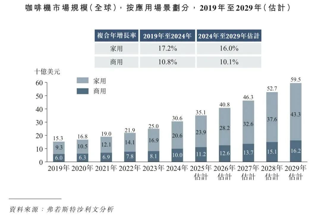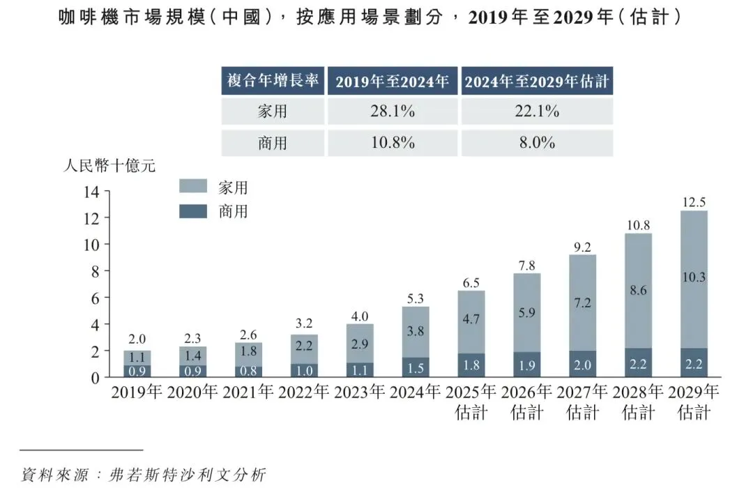 咖啡消费增长潜力巨大:中国庞大的人口基数为咖啡消费增长带来了重大机遇。2024年,中国人均咖啡消费量仅为14.3杯,而欧洲为567.9杯,北美为242.5杯,韩国为415.6杯,日本为280.8杯,东南亚为137.5杯。这一显着对比进一步体现于复合年增长率,中国市场在2019年至2024年间以14.7%的速度扩张,而欧洲及北美则录得相对稳定的增长。这突显了中国咖啡市场的巨大增长潜力。在经济持续发展及可支配收入上升的支持下,消费者越来越多地追求优质生活体验。咖啡文化的不断传播及普及,正将咖啡从偶尔的享受转变为日益增长的人群的日常必需品。这一转变预计将稳步提升中国的咖啡消费,为咖啡机带来强劲需求。