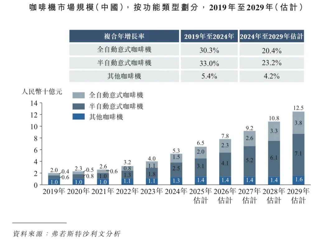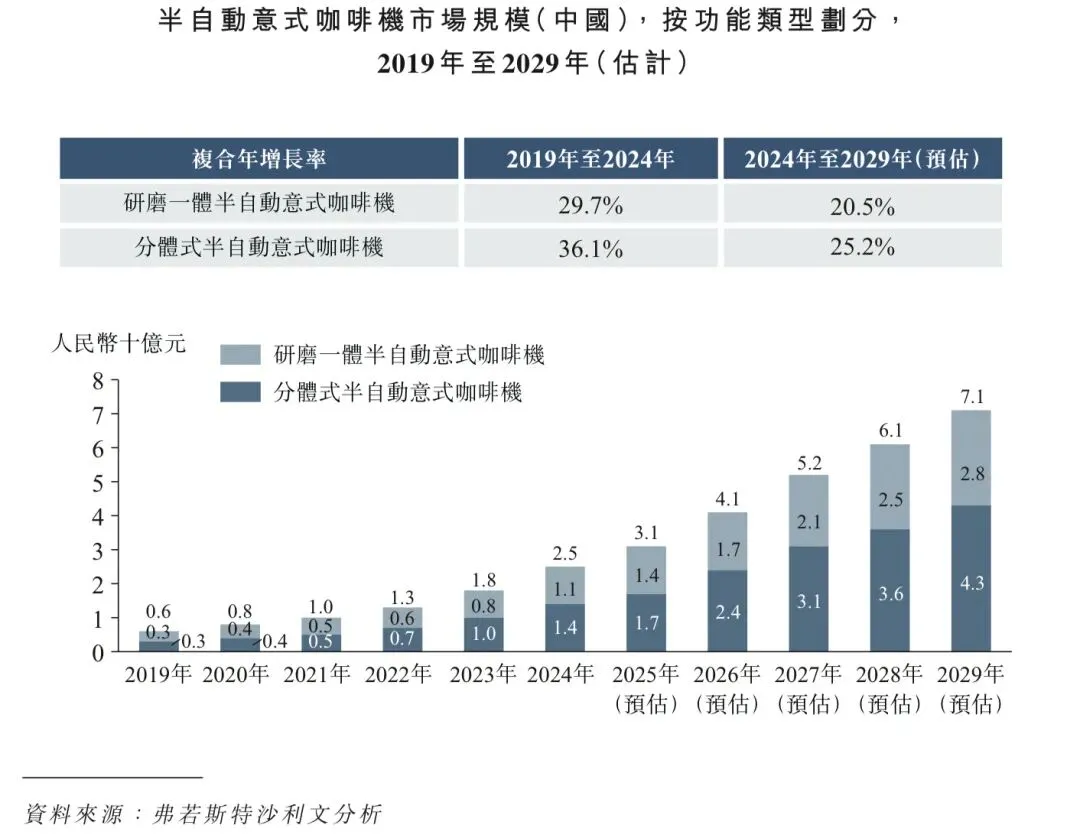 精品咖啡店增长推动对半自动咖啡机的需求:中国精品咖啡店的扩张显着提升对半自动咖啡机的需求。随着消费者愈加寻求高品质的手作咖啡体验,精品咖啡店—重视咖啡豆原产地、萃取精确度及定制化饮品—需提供兼具易操作及稳定性的设备。半自动咖啡机允许咖啡师手动调控研磨粗细程度、水温和萃取时间等关键变量,此机型是满足该等品质标准的理想选择。这一趋势受中国日益成熟的咖啡饮用者以及重视透明度及工艺的咖啡文化兴起所支撑。2024年至2029年,中国精品咖啡市场的复合年增长率预计将达22.6%,精品咖啡店数量预计将激增,从而进一步刺激半自动咖啡机市场由2024年的人民币25亿元增长到2029年的人民币71亿元,复合年增长率达23.2%。这一转变不仅有利于国际品牌,亦鼓励国内制造厂商开发迎合本土偏好且具竞争力的高性能机型。