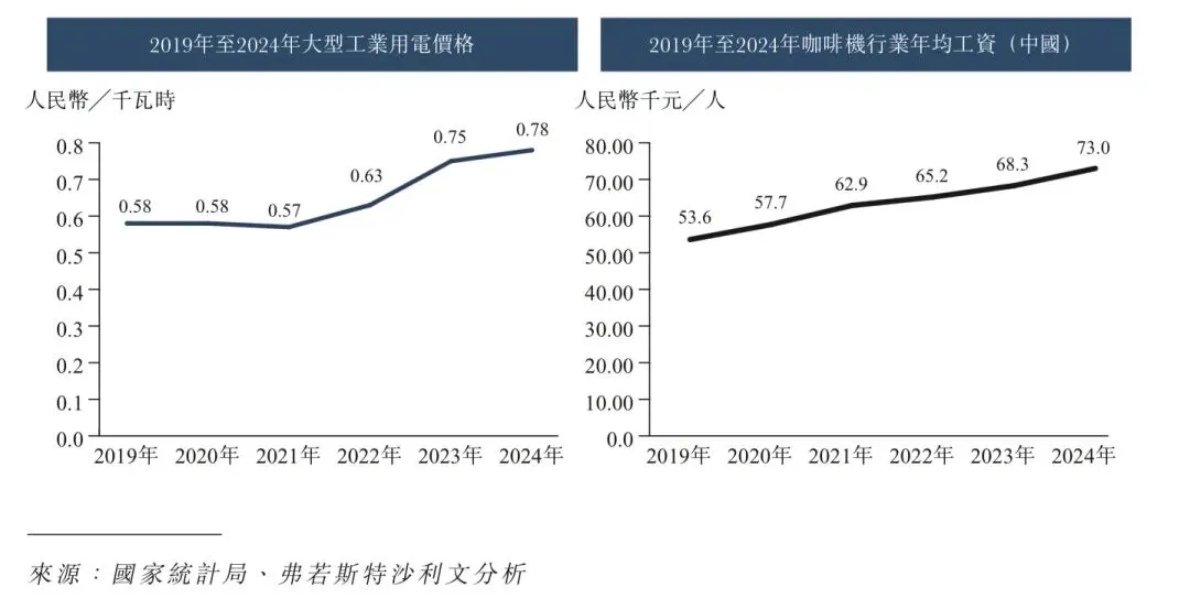 伴随宏观经济增长,2019年至2024年中国咖啡机行业从业人员年均工资从人民币5.36万元稳步上升至人民币7.30万元。展望未来,在宏观经济持续扩张、居民可支配收入增长及通胀压力推动下,预计未来五年劳动力成本将恢复上涨趋势。从长远看,行业薪资水平有望与国内名义GDP增速保持同步。随着中国经济持续增长及为促进国内企业发展,中国政府出台多项规则及政策降低工业用电成本。2019年至2022年,工业用电价格从人民币0.58元╱千瓦时降至人民币0.57元╱千瓦时。2024年,随着工业领域持续发展带来的用电需求增长,工业用电价格提升至人民币0.78元╱千瓦时。