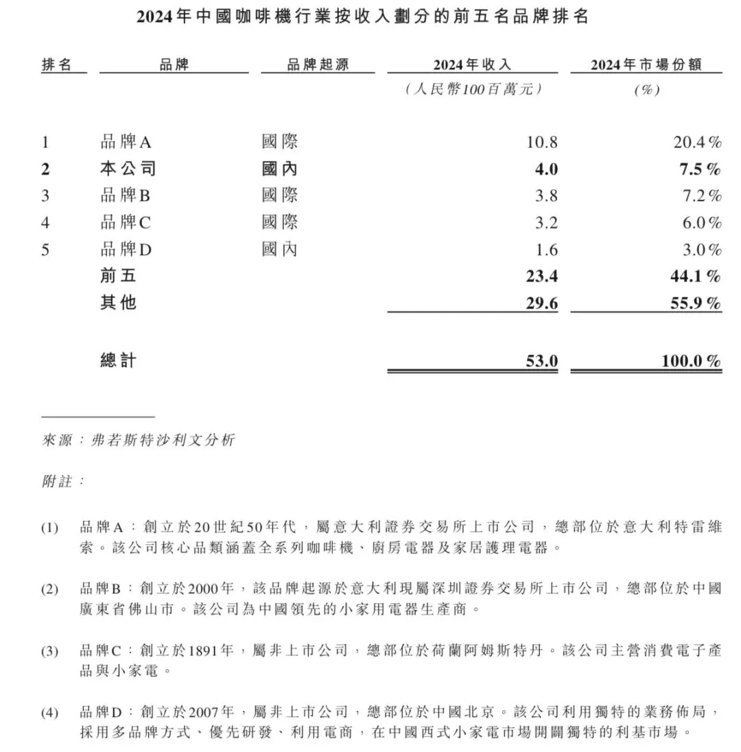 2024年中国咖啡机行业总收入达人民币53亿元,前五名市场参与者约占市场份额的44.1%。于2024年,格米莱为中国咖啡机行业第二大咖啡机品牌,市场份额约7.5%。到2024年,格米莱为中国咖啡机市场(就收入而言)最大的国产品牌。
