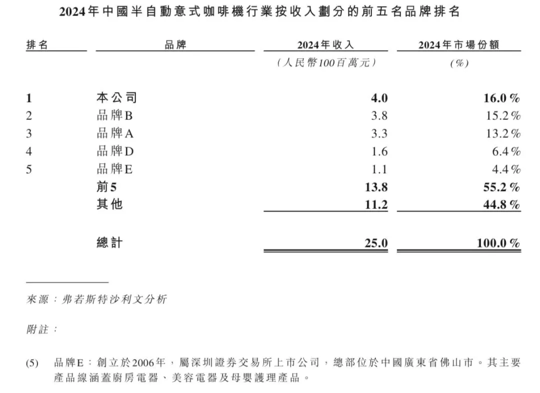 2024年中国半自动意式咖啡机行业总收入达人民币25亿元,其中前五名市场参与者约占55.2%。2024年,格米莱在中国半自动意式咖啡机行业中属第一大参与者。