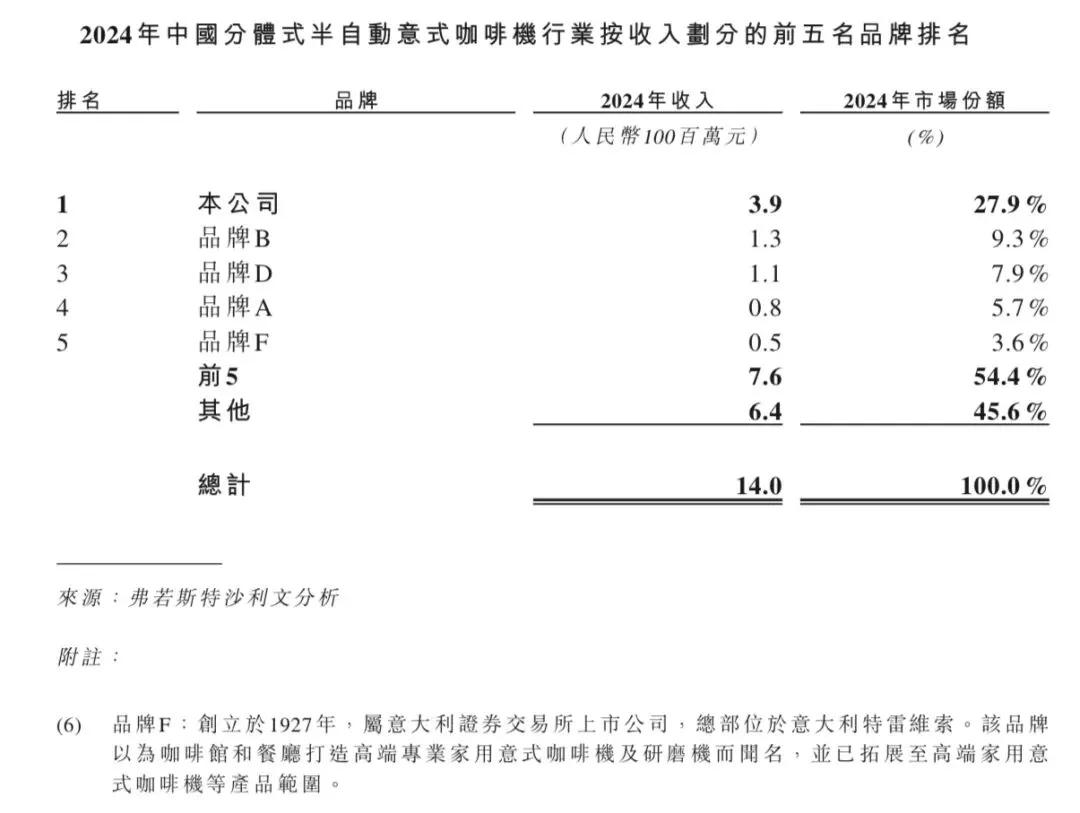 2024年中国分体式半自动意式咖啡机行业总收入达人民币14亿元,其中前五名市场参与者约占54.4%。2024年,格米莱在中国分体式半自动意式咖啡机行业中属第一大参与者。