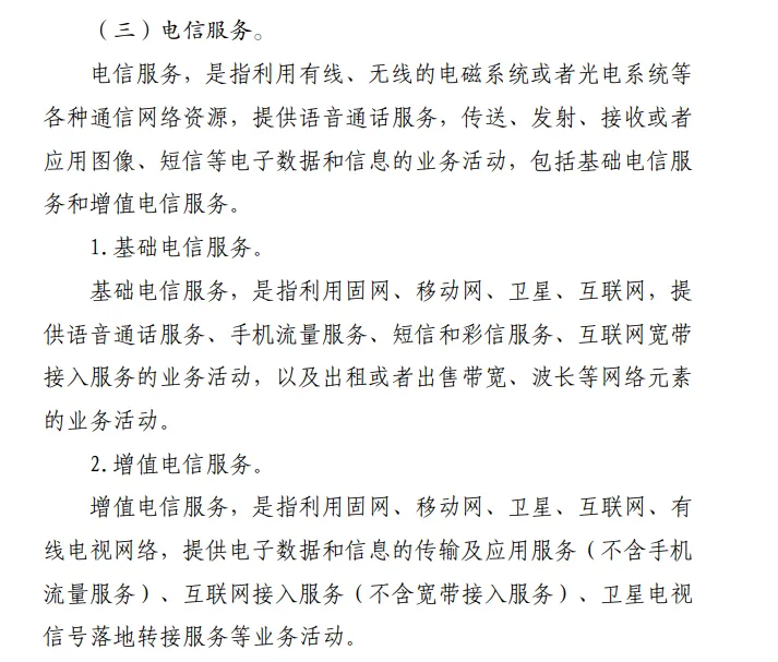 在这份电信条例的定义下,三大运营商如果提供宽带、流量、短信等产品给到普通百姓,既可以是基础电信服务(适用6%的较低税率),也可以是增值电信业务,条例确实没说得足够清楚。