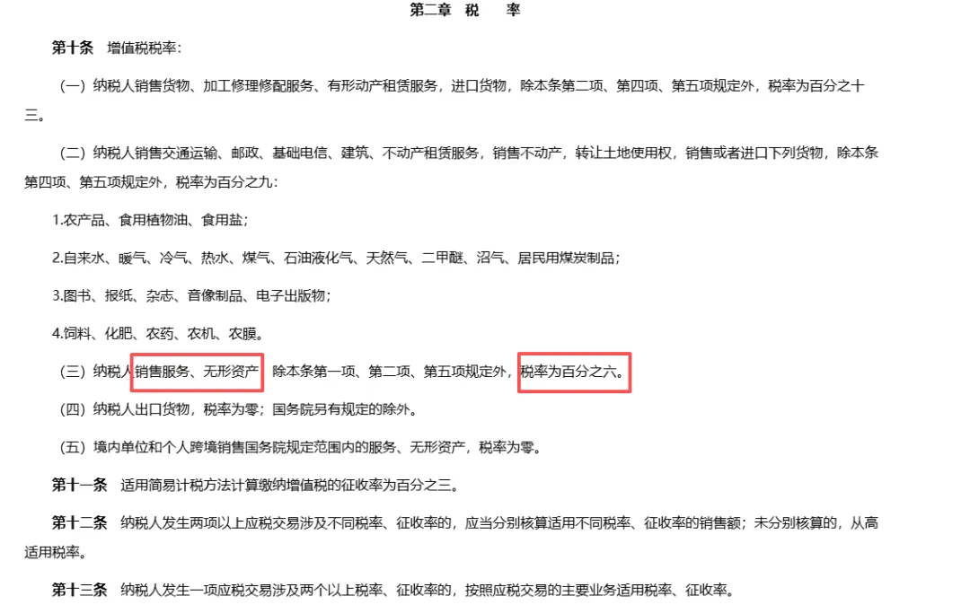 上面花了很长的篇幅,终于理清楚了电信税率变动的来龙去脉。 我们再来看互联网公司是否有同样风险,被调高增值税——其实《增值税法》说得很清楚。 销售服务、无形资产,除非是经营基础电信,否则税率一律为6%。