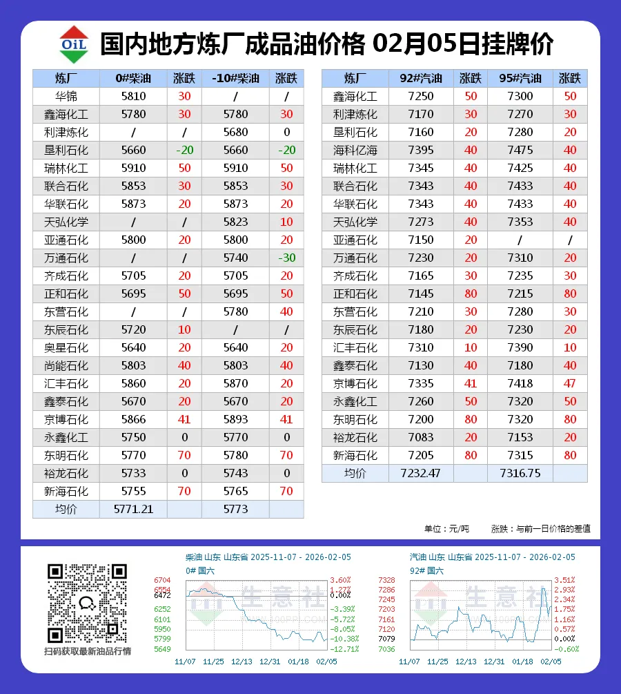 原油大涨,汽柴油价格继续上调!国内地方炼厂成品油价格 02月05日挂牌价