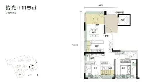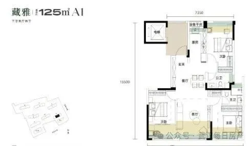 建面约115平的边套三房:分布在1号楼端头边户,3个卧室朝南,餐客厅一体全景舱设计,带独立电梯前室。
