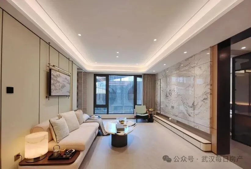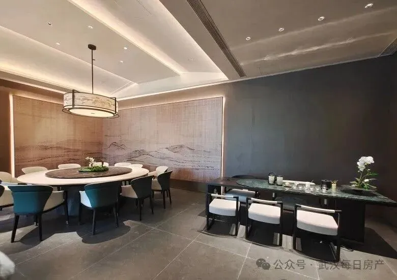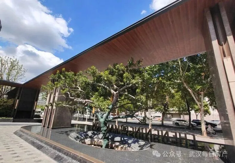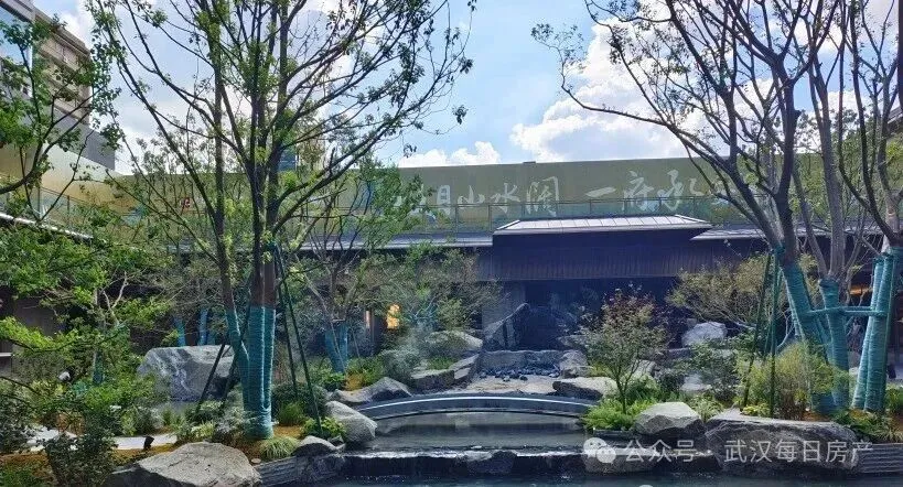 该项目也是武汉城建今年的四小龙之一,主打新中式风格,从目前的实景示范区来看,阔气大门、下沉庭院、会所等四代住宅的配置都有。