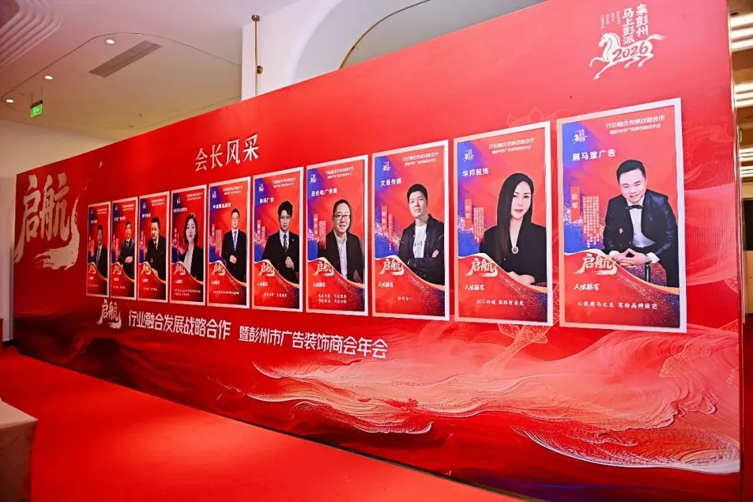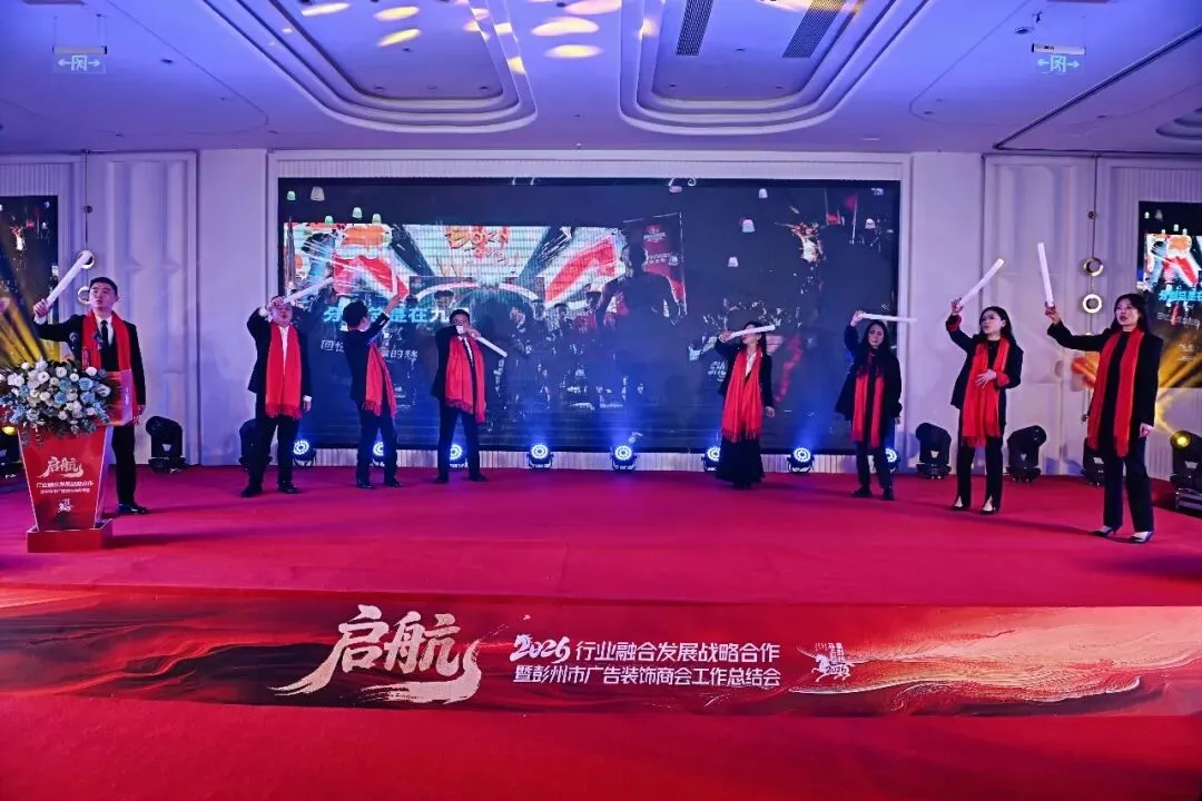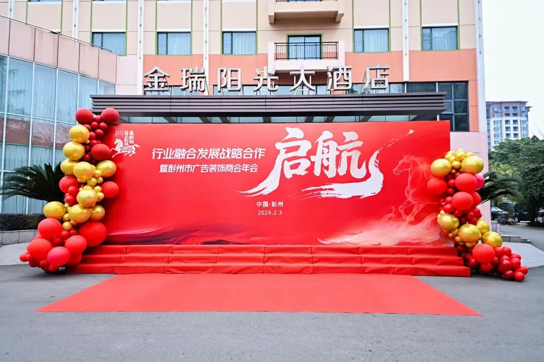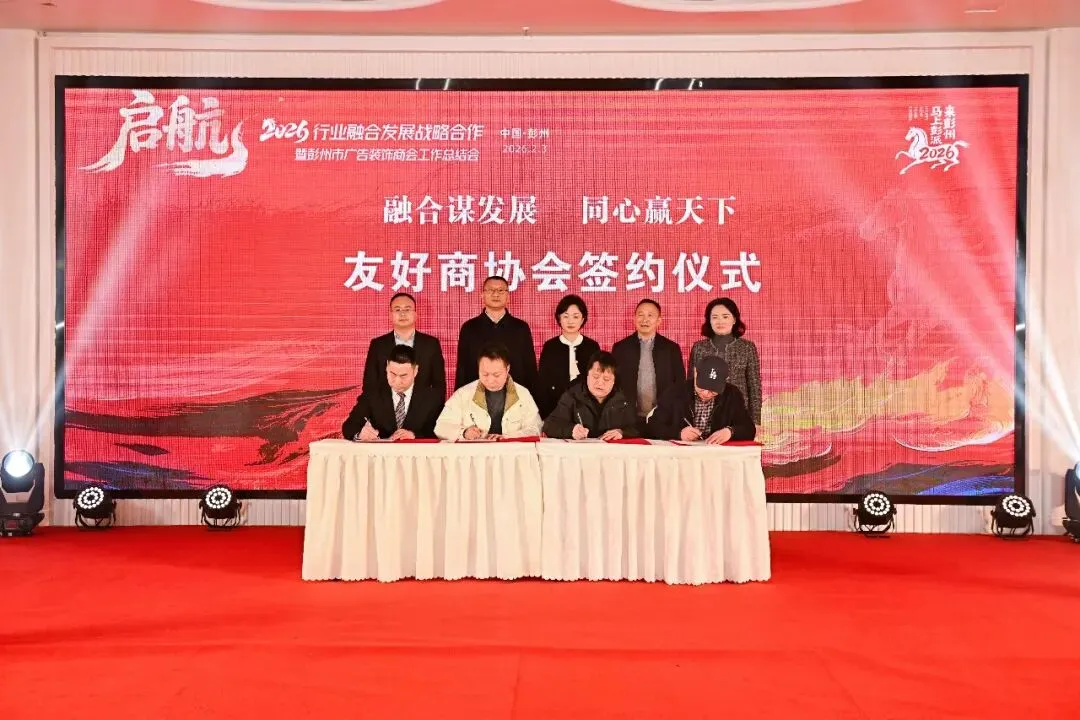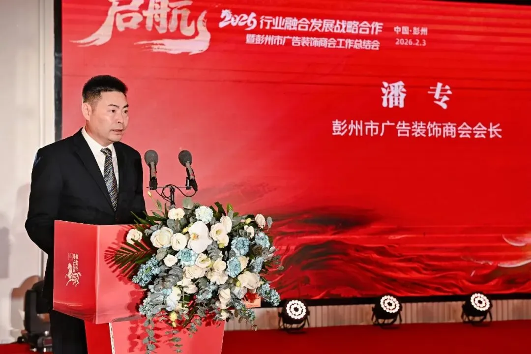 春潮涌动处,奋进正当时。2026年2月3日,行业融合发展战略合作暨彭州市广告装饰商会2025年工作总结暨2026年新春团拜会隆重举行。中共彭州市委常委、统战部部长陈楠,彭州市人大常委会党组副书记、副主任张强,彭州市政协副主席、民建彭州支部主委 陈伦平等一众领导嘉宾莅临现场,与行业企业家同仁、友好商协会代表欢聚一堂,共忆奋斗岁月,共话行业未来,共启融合新篇。本次年会以“行业融合发展战略合作”为核心,立足彭州市“千亿城、百万人、副中心”发展目标,既是对2025年行业发展成果的全面总结,更是推动广告、装饰、建材产业协同升级的重要契机。现场氛围热烈庄重,亮点纷呈,凝聚起政企同心、行业聚力的强大共识。年会最受瞩目的环节,莫过于行业融合发展战略签约仪式。彭州市广告装饰商会与四川省智慧标识行业协会、成都广告标识服务行业协会、温江区广告传媒商会携手落笔,签订战略合作协议。这一重要举措,不仅是行业资源的强强联合,更是赋能民营企业转型升级、助力彭州城市IP传播的关键一步。中共彭州市委常委、统战部部长 陈楠,彭州市人大常委会党组副书记、副主任 张强,彭州市政协党组成员、副主席 吴光辉,彭州市政协副主席、民建彭州支部副主委 陈伦平,彭州市工商联党组书记 兰东春亲临见证,共同期许四方以签约为起点,汇聚创意与传播合力,让“天彭牡丹”的国色、“蔬式生活”的雅趣、“龙门越野”的激情与“天府药市”的康养走向更广阔的舞台,让“彭派生活”成为彭州闪亮的城市名片。会上,中共彭州市委常委、统战部部长陈楠发表重要讲话,对商会及行业过去一年的贡献给予高度肯定,并结合彭州发展蓝图,为行业未来发展指明方向。领导的殷切嘱托,让在场企业家备受鼓舞,更坚定了深耕行业、服务城市的信心与决心。彭州市广告装饰商会会长潘专作2025年工作报告,全面回顾了商会在市委市政府领导、市工商联指导下,紧跟“立园满园”行动步伐,推动产业聚链成群的丰硕成果。一组组数据、一项项实绩,彰显了行业与城市共生共荣的发展底色。中共彭州市委常委、统战部部长 陈楠