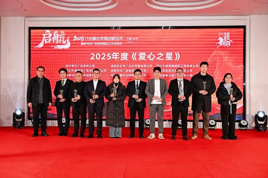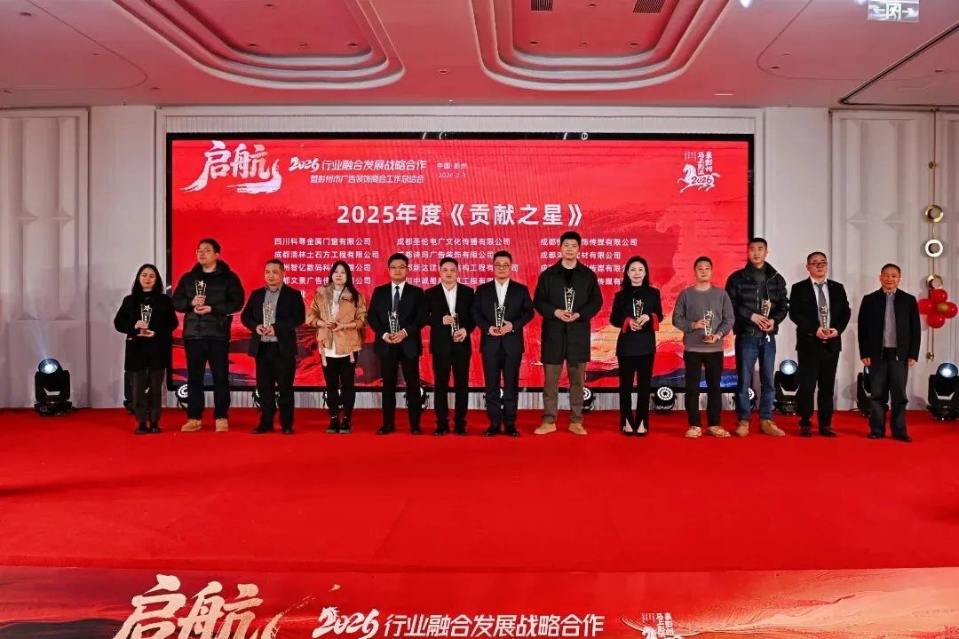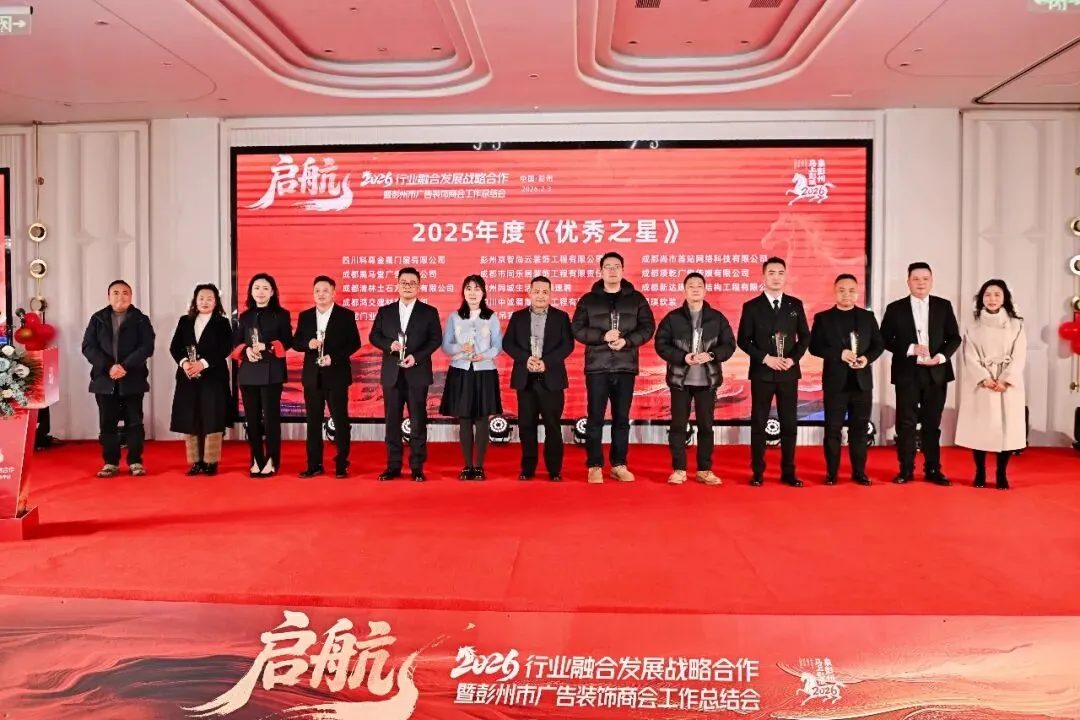 彭州市餐饮行业商(协)会、彭州市女企业家商(协)会、成都福建商会、彭州市青年企业家商会、彭州市丽春镇商会、彭州市食品产业商会、彭州市企业咨询和环保商(协)会、彭州市家纺服装商(协)会、彭州市个体私营经济协会、彭州市个体私营经济协会天彭分会、彭州市个体私营经济协会致和分会、彭州市快乐健康俱乐部、彭州市印刷行业协会、彭州市九尺家禽业联合会、彭州市建材家居工业协会、彭州市建筑业协会。为表彰先进、凝聚榜样力量,年会特别设置“五星表彰盛典”,对42家“优秀之星”企业、多个“爱心之星”“行业之星”“贡献之星”及5位“闪耀之星”政协委员进行隆重授奖。获奖企业与个人深耕主业、勇于创新,以专业赋能城市发展;积极投身公益、参政议政,用责任诠释“彭州温度”与担当。表彰不仅是对过往成绩的肯定,更是对未来行业高质量发展的期许与鞭策。此外,年会还为新晋会员企业、常务副会长及副会长单位授牌,为行业注入新鲜血液,壮大发展力量。除了庄重的会议环节,年会还设置了配乐演讲《我的这五年》,重温行业与城市共成长的奋斗时光;多轮抽奖环节穿插其中,彭州好物、特色礼品与重磅大奖轮番送出,现场欢声笑语不断。最后,全体常务副会长上台祝酒,与会嘉宾共同唱响《成都》,在熟悉的旋律中寄托对彭州的热爱与祝福。歌声袅袅,定格相聚的温馨;前路漫漫,承载共同的期许。此次年会的圆满举行,不仅搭建了政企沟通、行业交流的坚实平台,更以战略合作的深度融合为突破口,为彭州广告装饰建材行业的发展注入新动能。2026年,行业将以彭州两会精神与十五五规划为指引,凝心聚力、深耕细作,让行业发展与城市建设同频共振,为“千亿城、百万人、副中心”建设添砖加瓦,共同书写彭州与行业更加美好的明天!