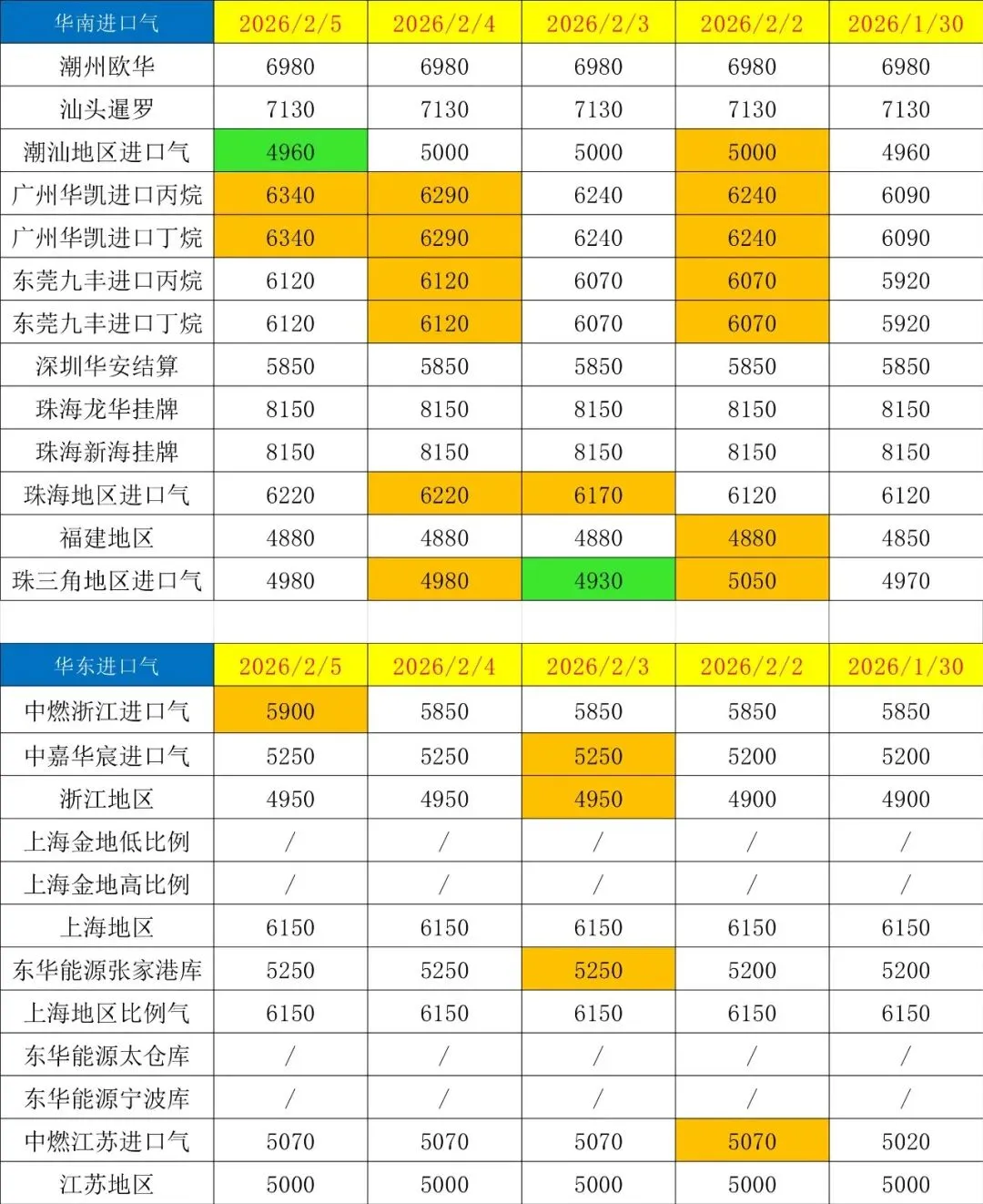 当前位置:首页>行情>【2026-2-5】液化气价格行情:大宗月度+期货+国际到岸+进口气+全国炼厂+二甲醚+油类竞品