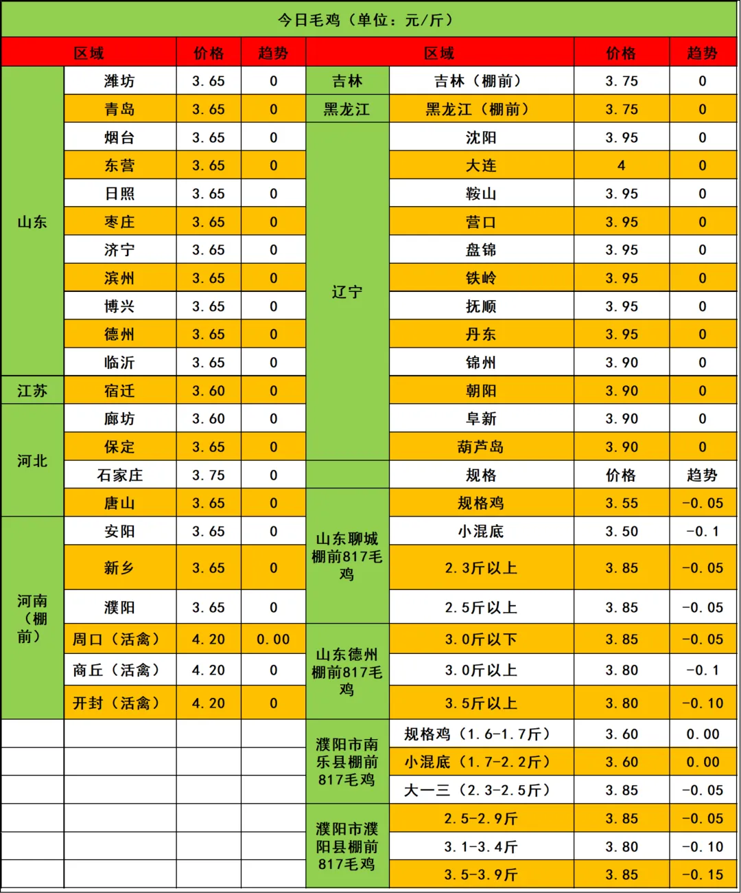 注:各地毛鸡以实际成交为准,其中活禽交易价格差异大。实际局部根据产品行情、消费、毛鸡出栏现状分析,实际收购价格与报价有一定差距,价格只供参考。