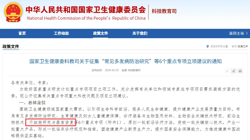 - 国家卫健委将“干细胞研究与器官修复”纳入重点研发计划,投入4.3亿元。