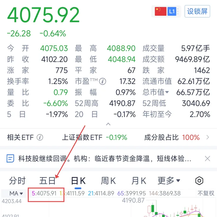 收盘指数点位4075.92硬是比5日均线位4075.91高0.01个点