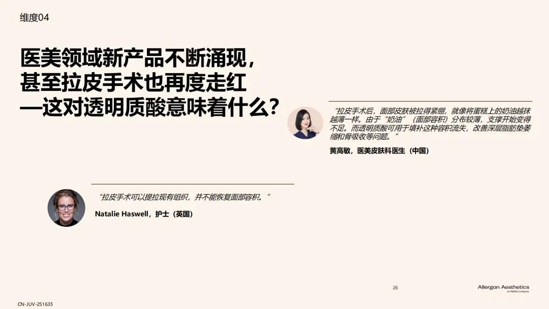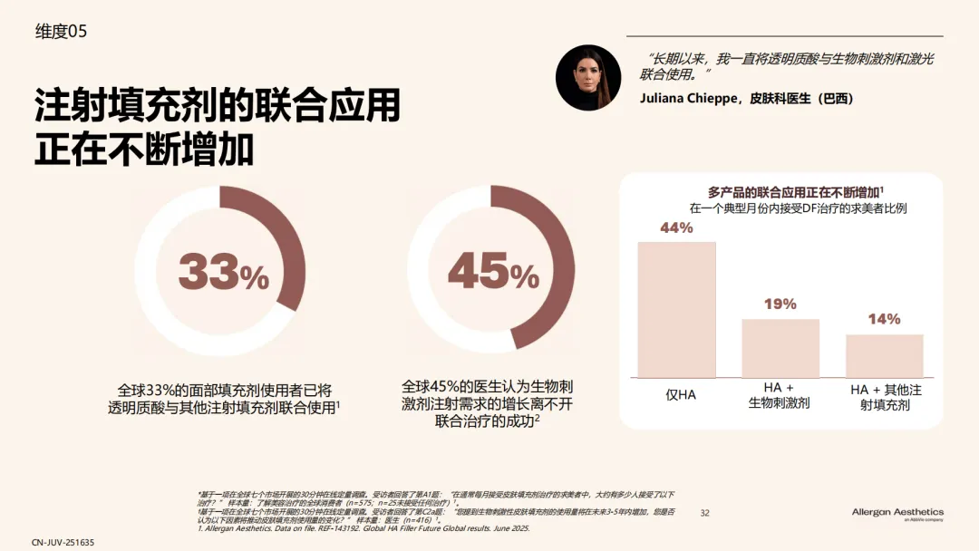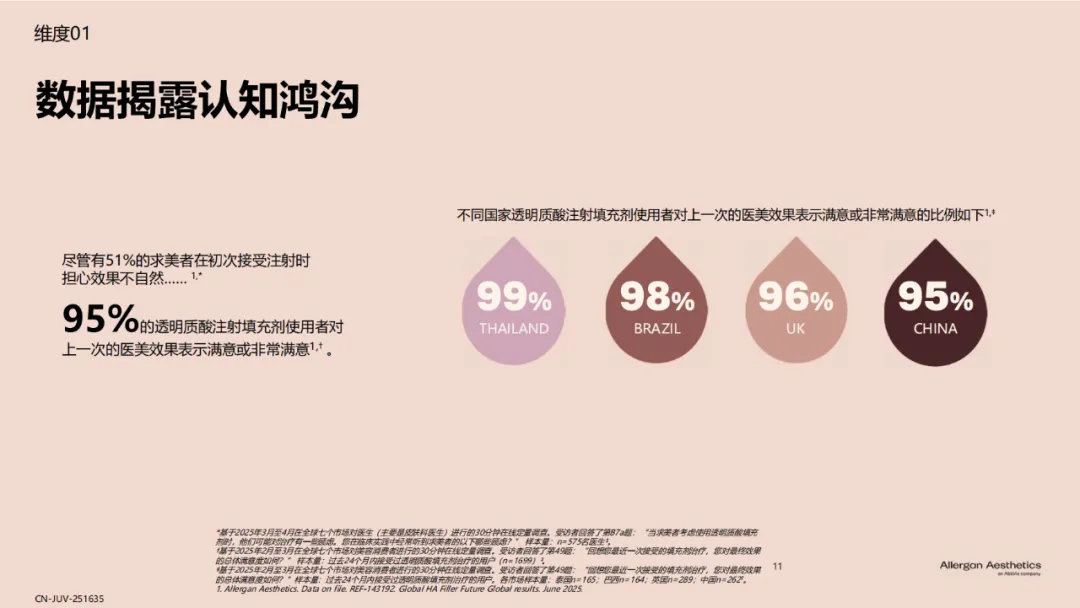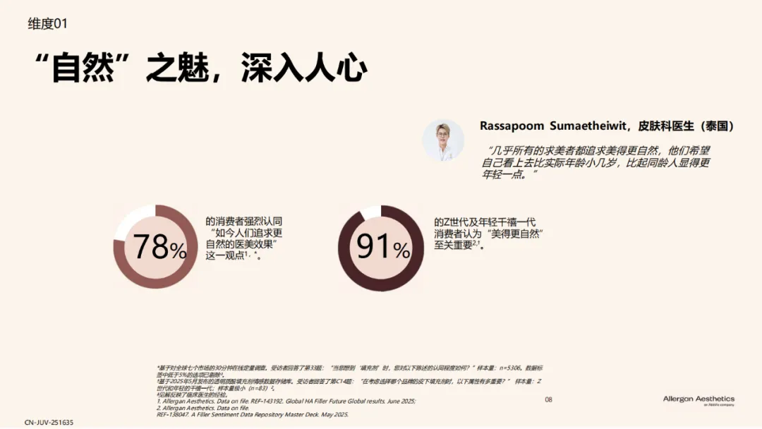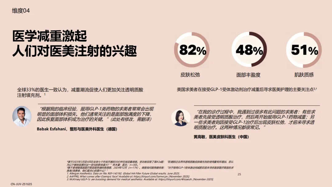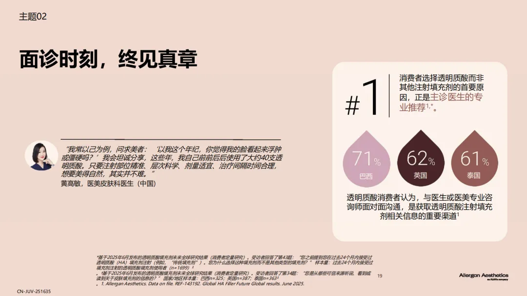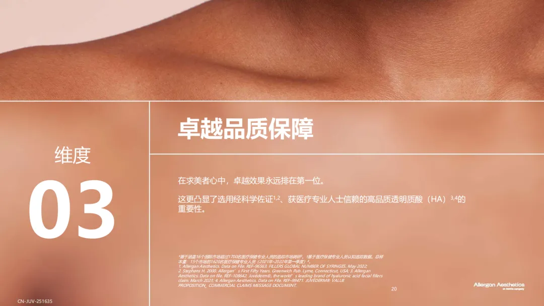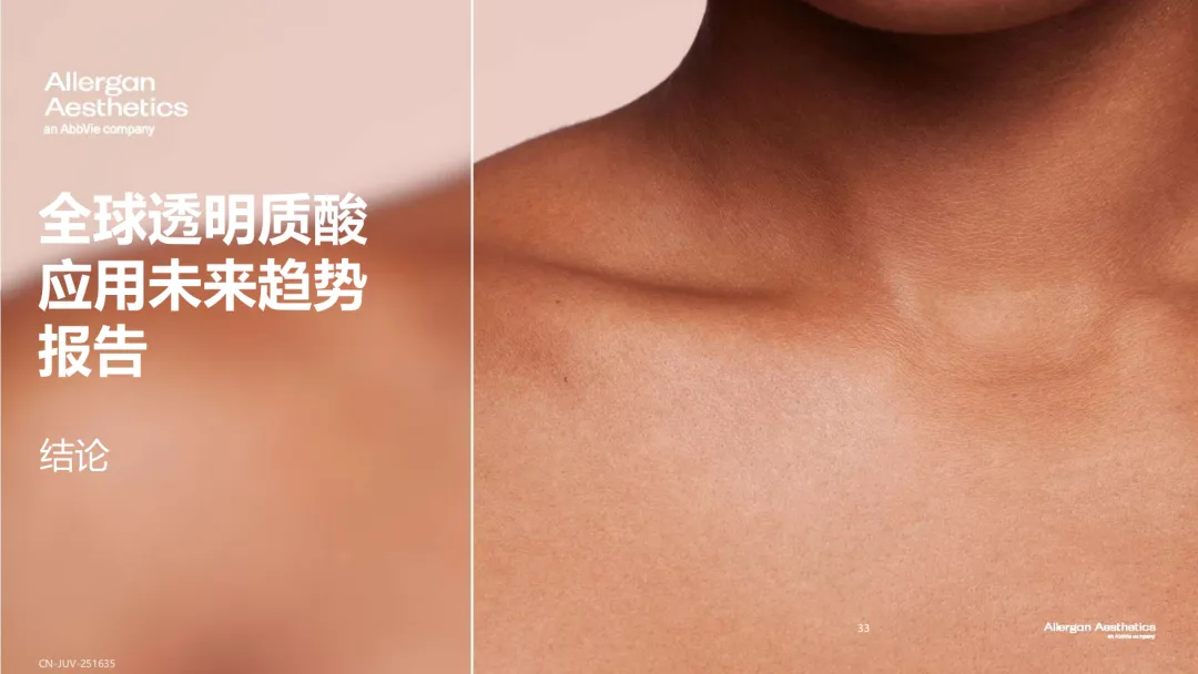 报告揭示了效果可预测(65%)、自然满意效果(67%)、20年临床使用安全性(62%)¹是透明质酸填充剂历经多年市场考验,成为美学领域基石材料的原因。
