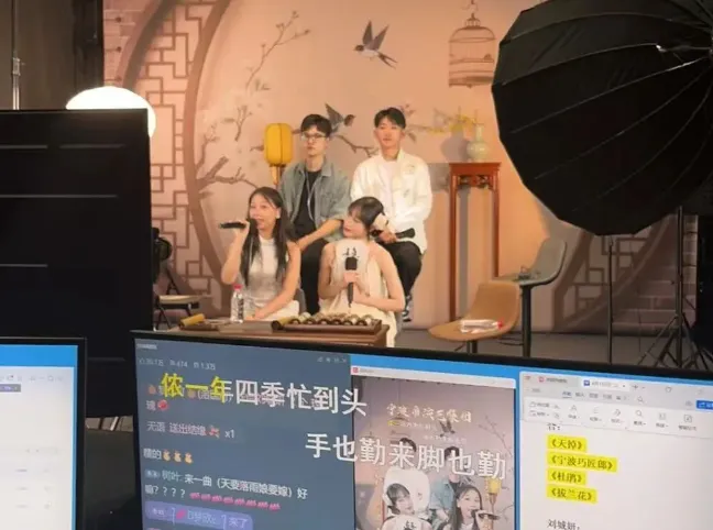 图源:4位甬剧演员正坐在屏幕前演唱经典《拔兰花》
