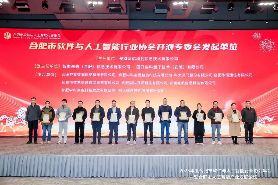 为推动合肥市软件与人工智能领域开源技术创新与生态建设,合肥市软件与人工智能行业协会正式成立开源专业委员会。凭借在开源技术与生态构建方面的长期积累与突出贡献,科大国创被授予“开源专委会发起单位”。