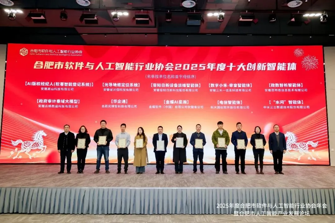 王颜颜博士从“知识”与“算力”融合、“硅基”与“碳基”协同的视角出发,深入剖析了数字员工在智能运营、效率提升和生产力重塑方面的关键作用。她结合科大国创在人工智能、数据智能等领域的实践,分享了如何通过技术融合推动企业数字化转型,构建面向未来的运营支撑体系,为现场嘉宾带来深刻启发。在本次年会的评优环节,科大国创凭借在人工智能技术研发、场景落地与产业赋能方面的突出表现,其打造的“电信智能体” 被授予 “合肥市软件与人工智能行业2025年度十大创新智能体” 荣誉。该奖项不仅体现了行业对科大国创在电信领域AI技术创新与应用能力的充分肯定,也展现了公司在推动行业智能化转型中的重要贡献。此次参会,科大国创不仅展示了在人工智能与软件融合创新方面的前沿思考与实践成果,也进一步加强了与行业协会及生态伙伴的交流与合作。